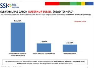 Wartalist.com – MAKASSAR — Lembaga Script Survei (SSI) Indonesia merilis hasil survei bulan September 2024 terkait elektabilitas pasangan calon (paslon) dalam Pemilihan Gubernur (Pilgub) Sulawesi