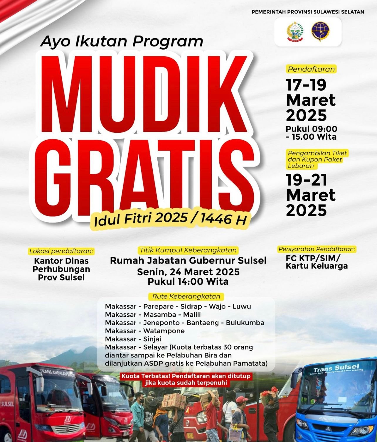 , Sulsel – Pemerintah Provinsi Sulawesi Selatan kembali menggelar program Mudik Gratis Idul Fitri 2025/1446 H untuk membantu masyarakat yang ingin pulang kampung saat Lebaran. Program ini diperuntukkan bagi warga yang berdomisili di Sulawesi Selatan dengan berbagai tujuan di kabupaten/kota.